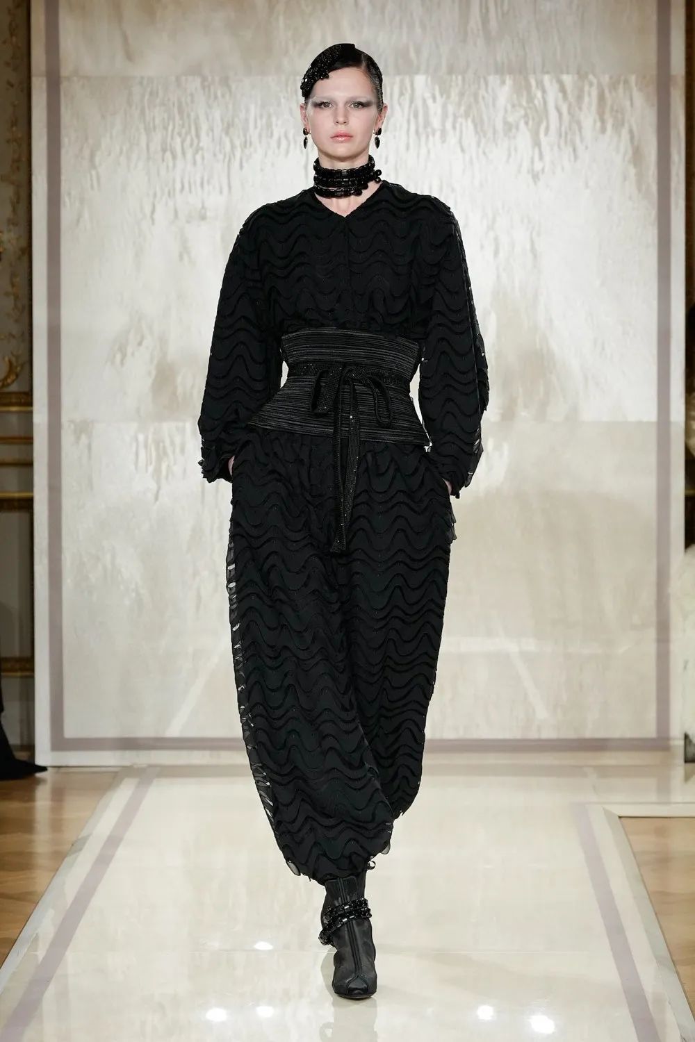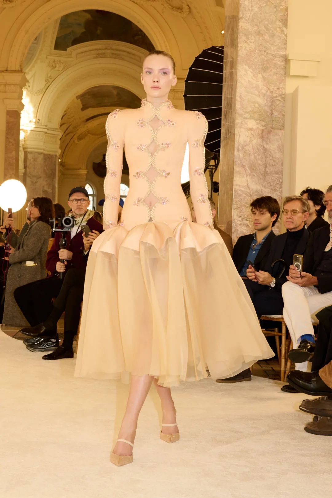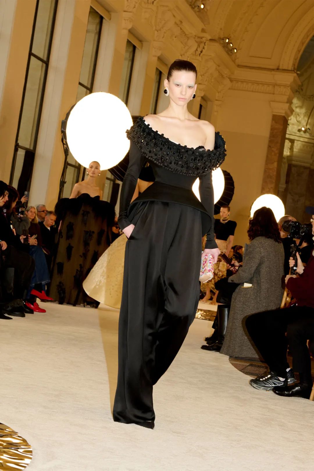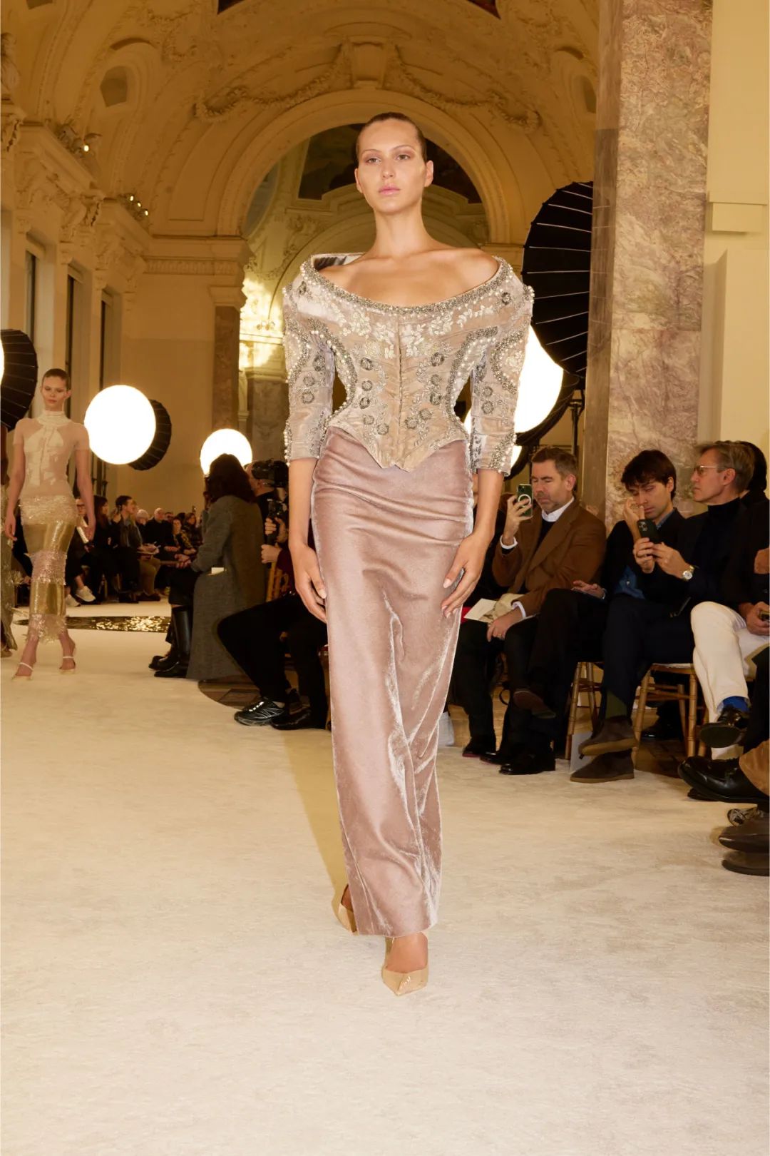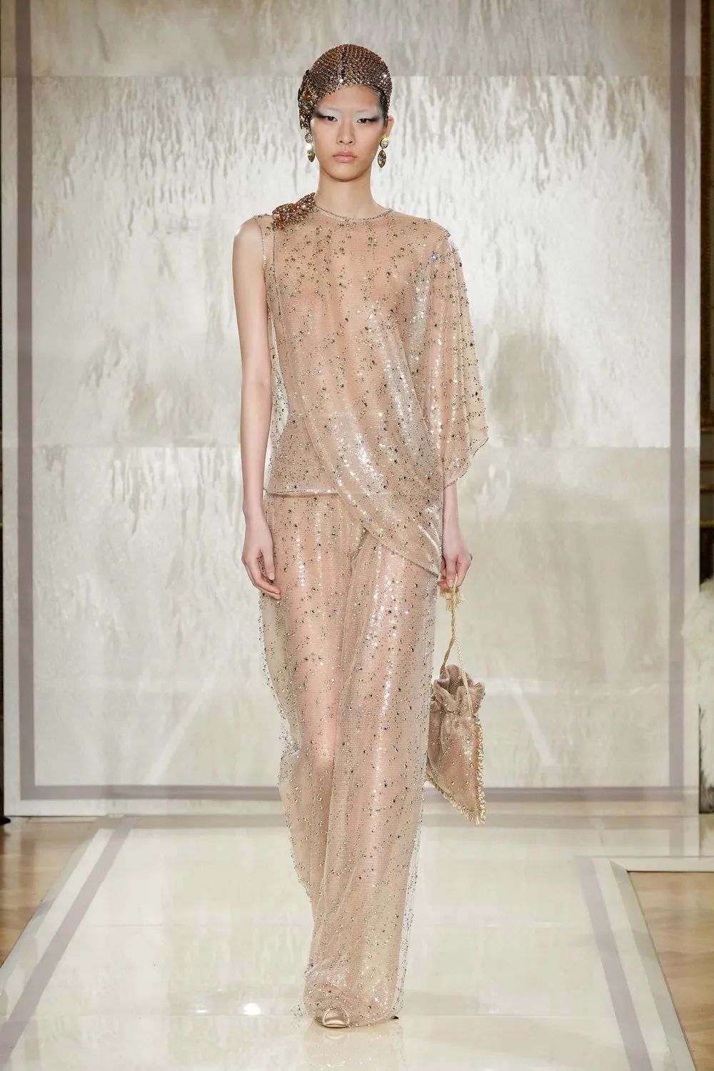 时装秀的轮廓向格蕾夫人(Madame Grès)、查尔斯·弗雷德里克·沃斯(Charles Frederick Worth)、保罗·波烈(Paul Poiret)等标志性女装设计师致敬。裸色和透明的礼服以不对称的重量挂在身上。错视珍珠覆盖在紧身胸衣上,而s型夹克则为精细剪裁提供了证据。从绣有奢华日本号角珠的蛇形曲线,到用法国紧身胸衣塑造的戏剧性、锋利的臀叶,每一个设计都把模特变成了空灵的存在,散发出一种神圣的、超凡脱俗的魅力。