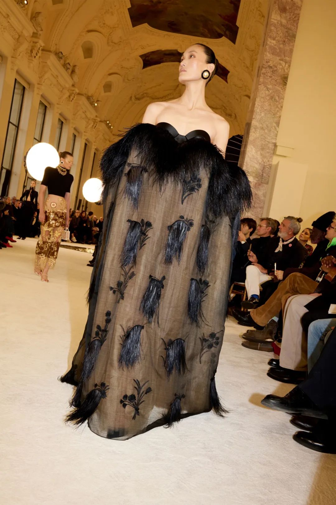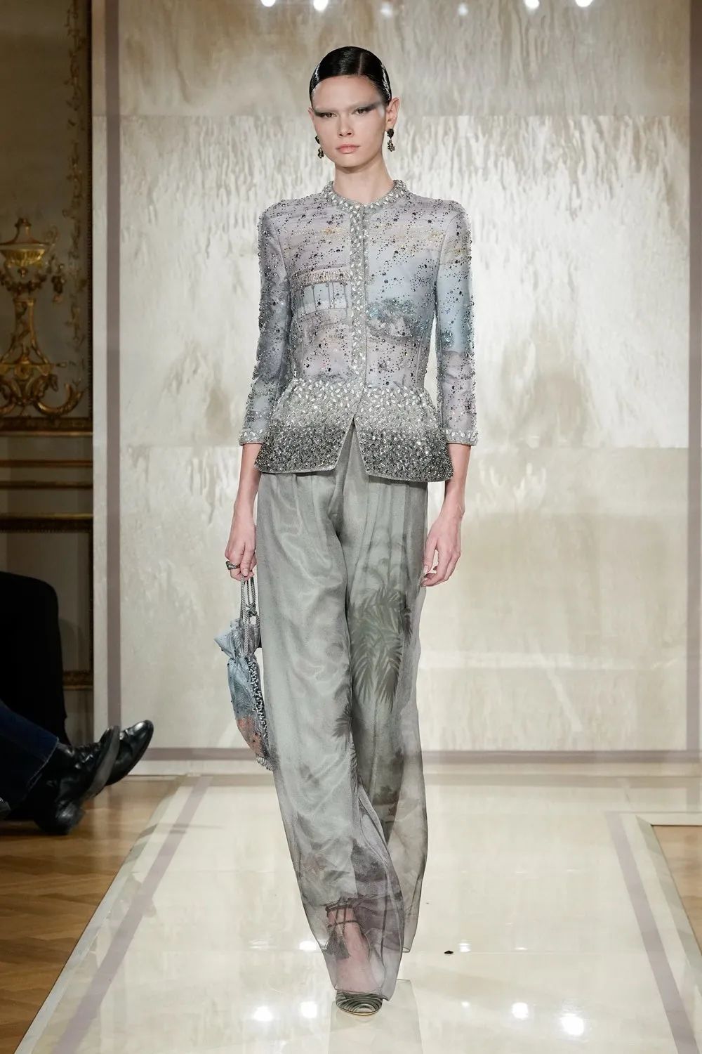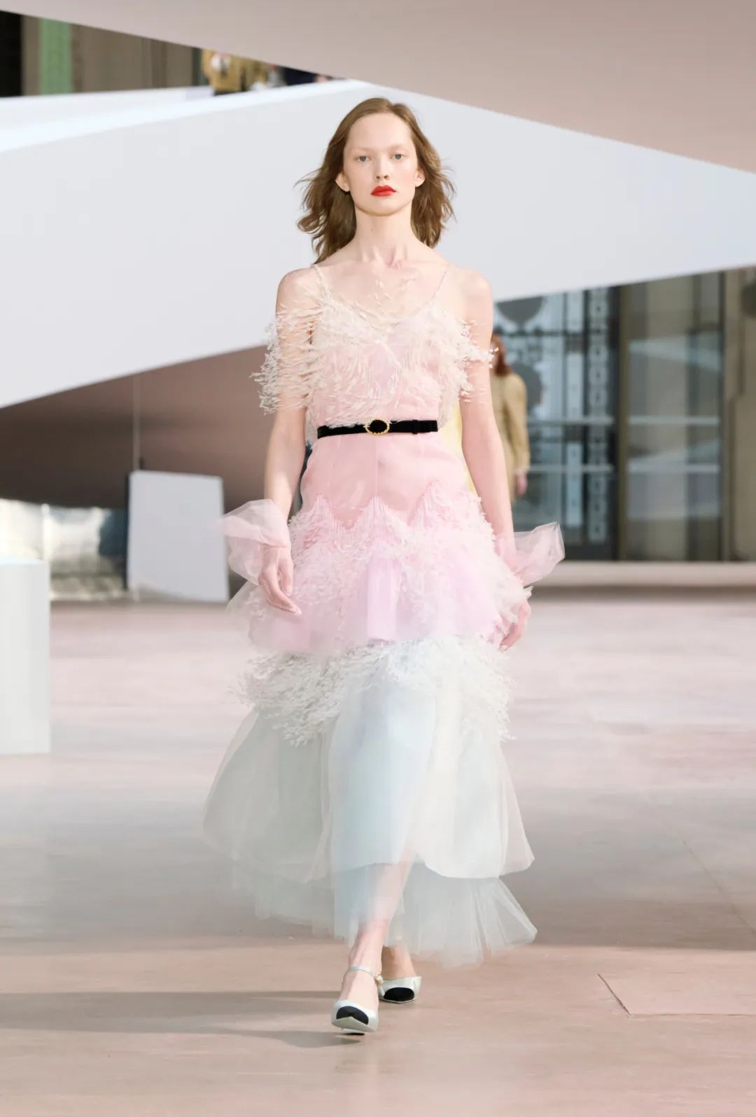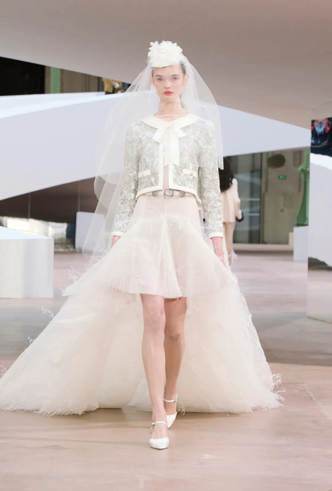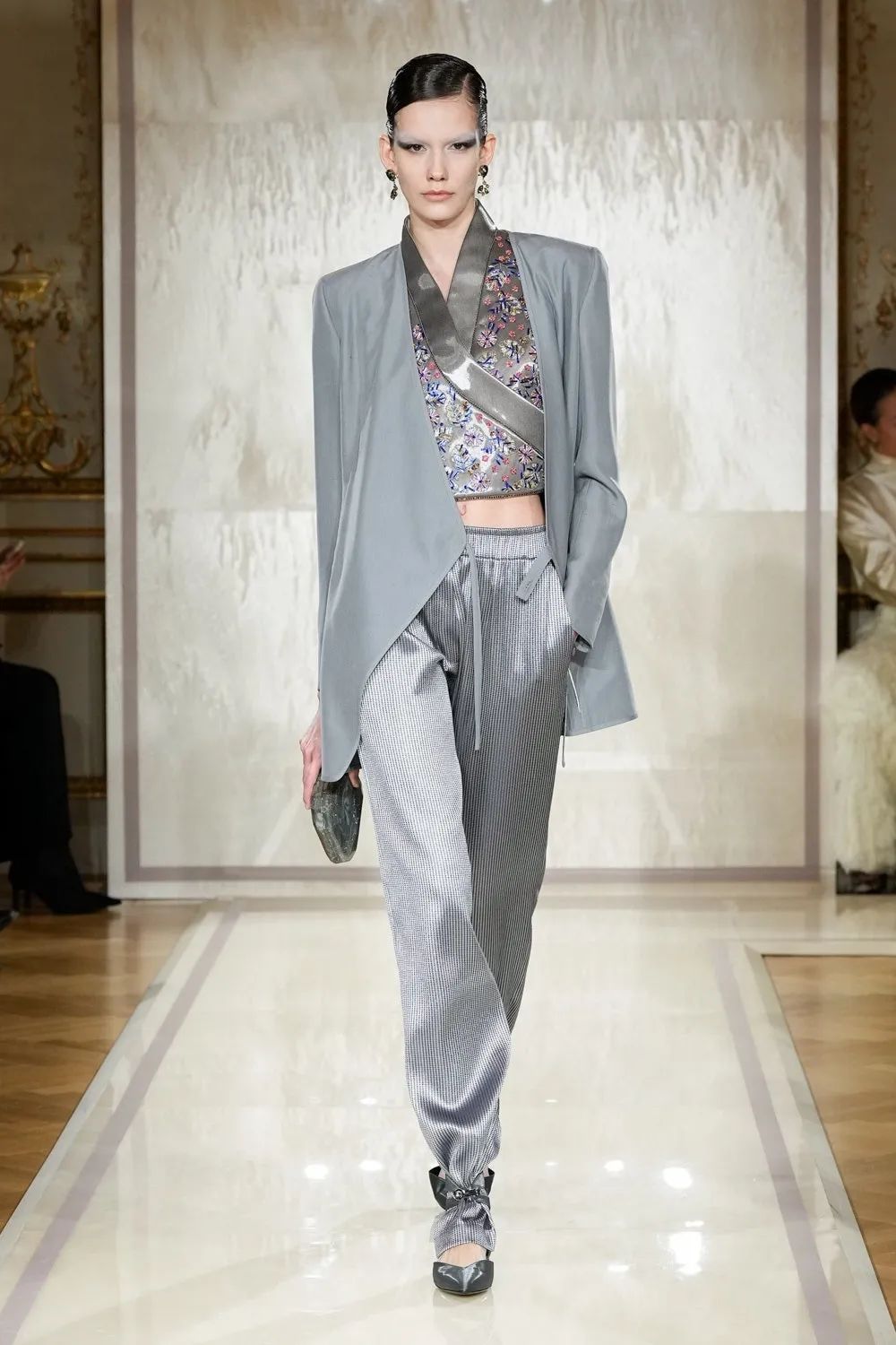 时装秀的轮廓向格蕾夫人(Madame Grès)、查尔斯·弗雷德里克·沃斯(Charles Frederick Worth)、保罗·波烈(Paul Poiret)等标志性女装设计师致敬。裸色和透明的礼服以不对称的重量挂在身上。错视珍珠覆盖在紧身胸衣上,而s型夹克则为精细剪裁提供了证据。从绣有奢华日本号角珠的蛇形曲线,到用法国紧身胸衣塑造的戏剧性、锋利的臀叶,每一个设计都把模特变成了空灵的存在,散发出一种神圣的、超凡脱俗的魅力。