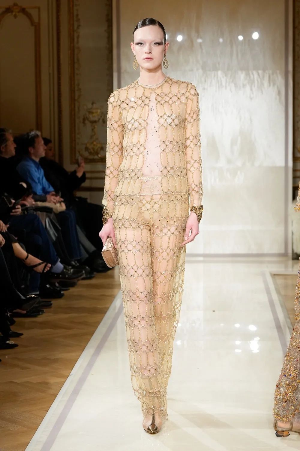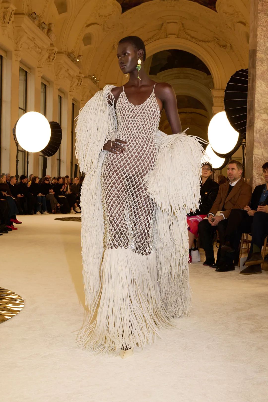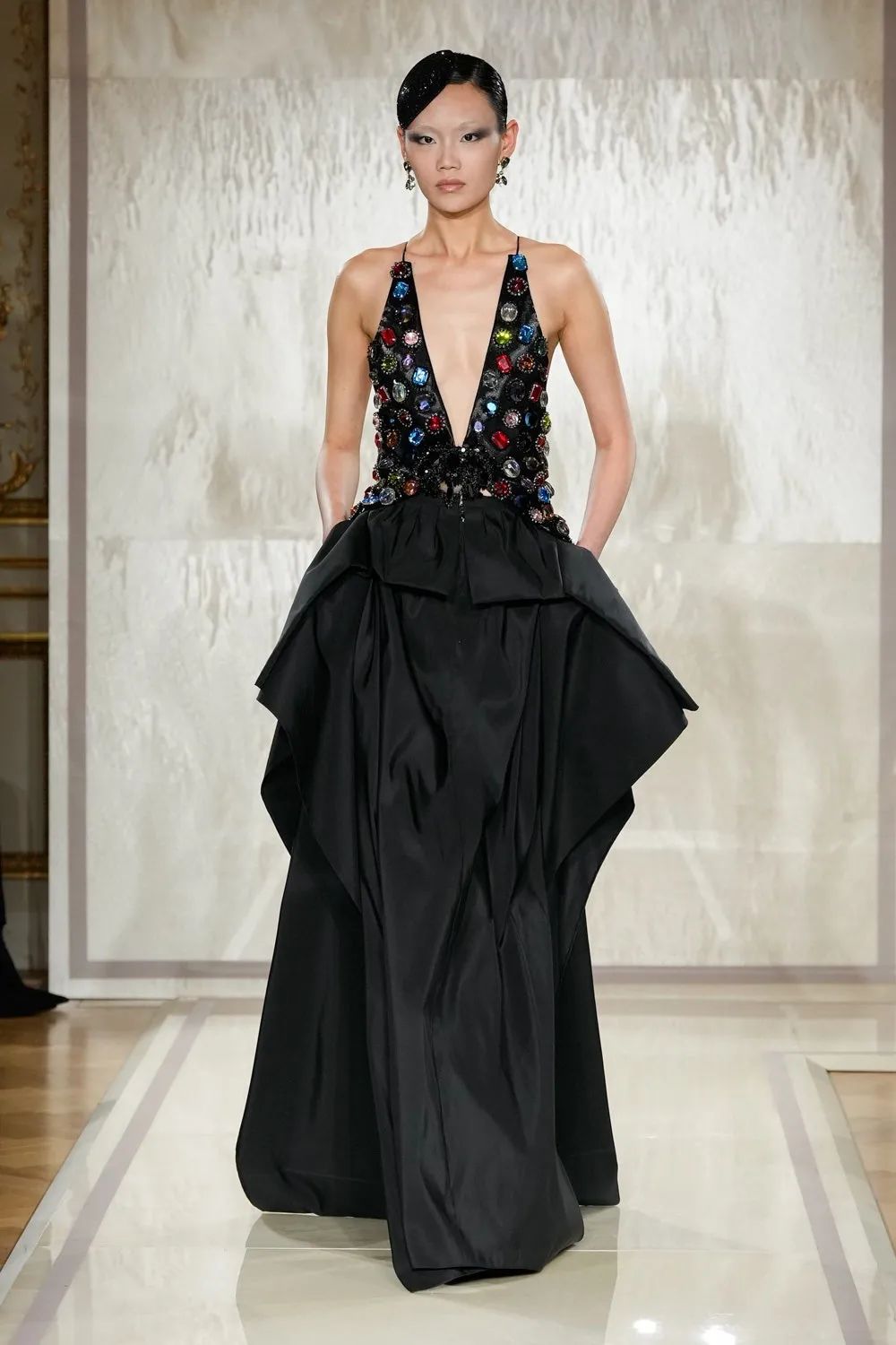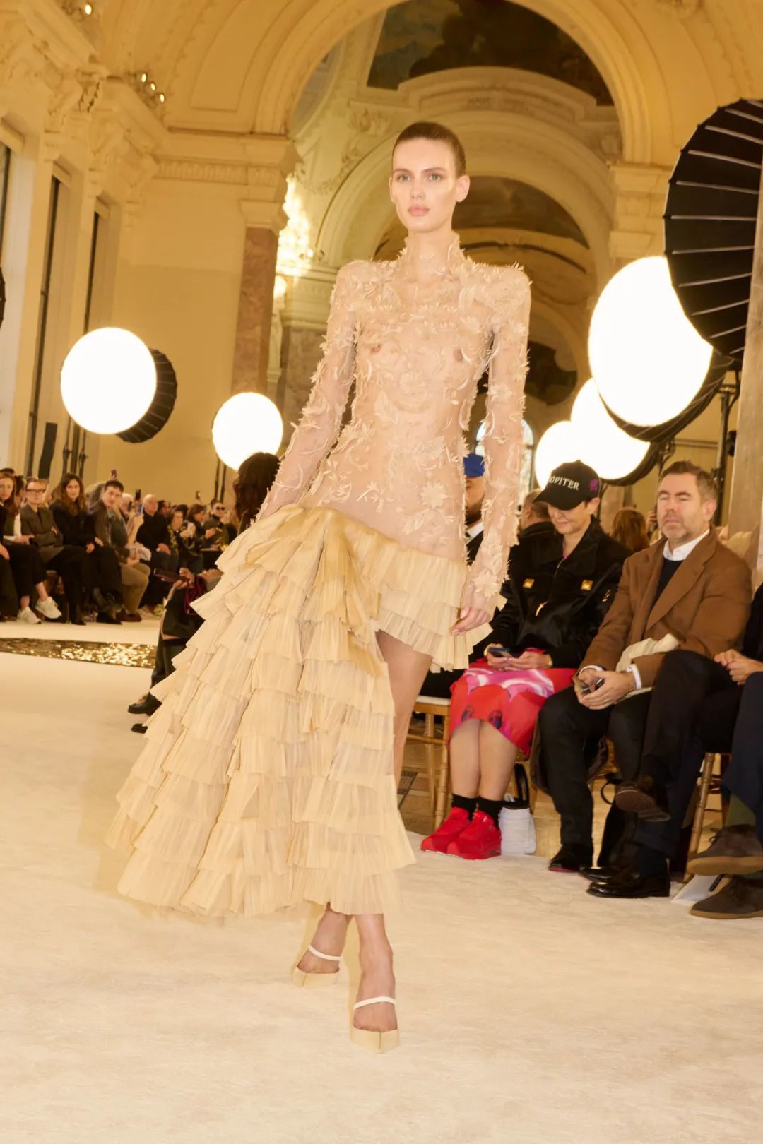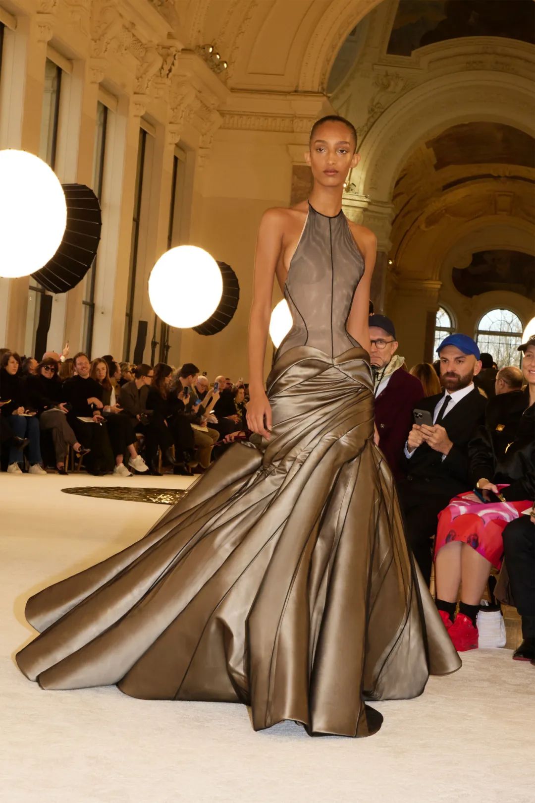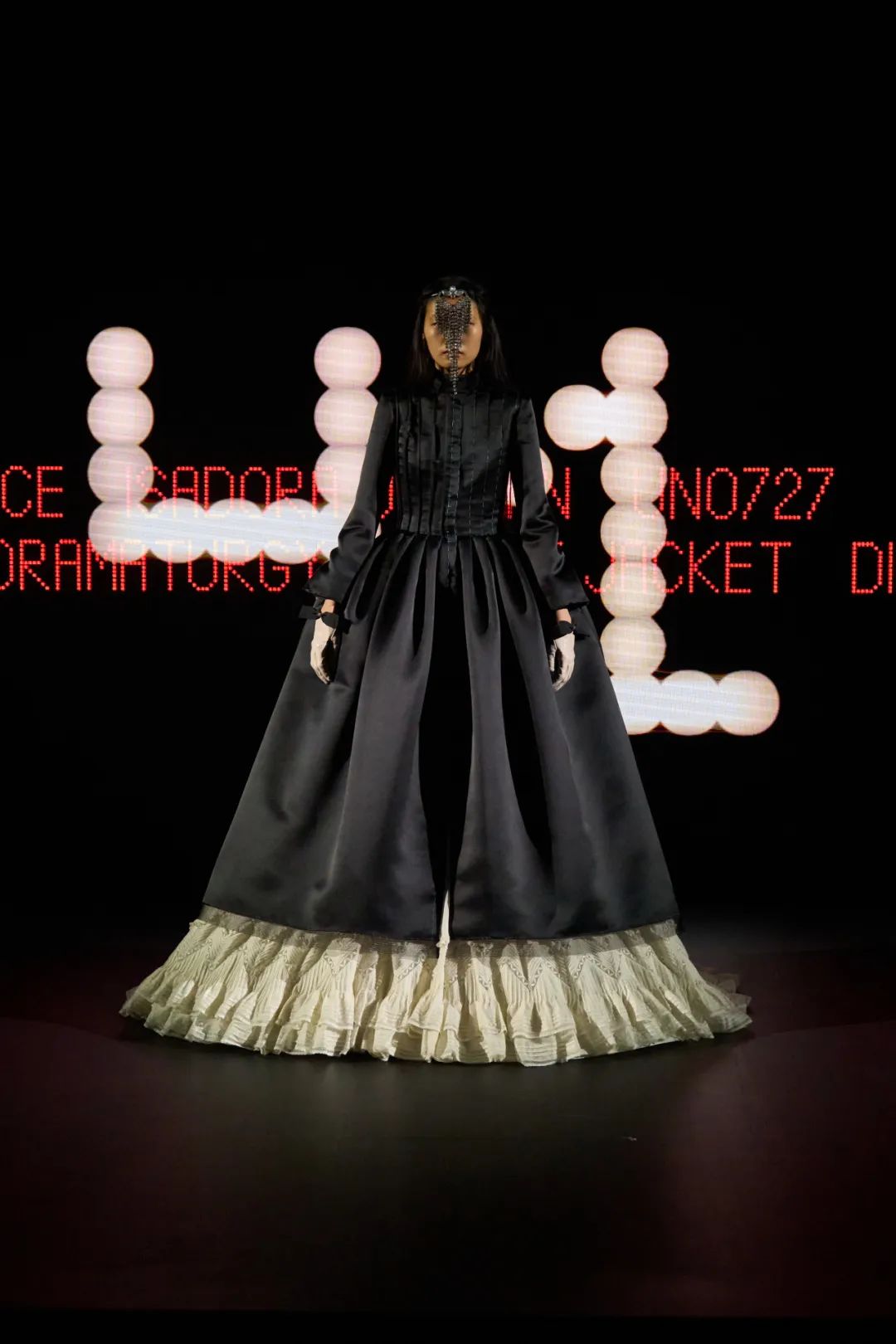 时装秀的轮廓向格蕾夫人(Madame Grès)、查尔斯·弗雷德里克·沃斯(Charles Frederick Worth)、保罗·波烈(Paul Poiret)等标志性女装设计师致敬。裸色和透明的礼服以不对称的重量挂在身上。错视珍珠覆盖在紧身胸衣上,而s型夹克则为精细剪裁提供了证据。从绣有奢华日本号角珠的蛇形曲线,到用法国紧身胸衣塑造的戏剧性、锋利的臀叶,每一个设计都把模特变成了空灵的存在,散发出一种神圣的、超凡脱俗的魅力。