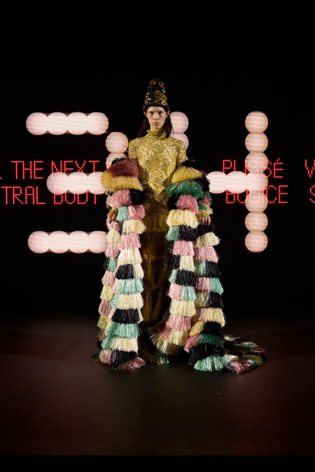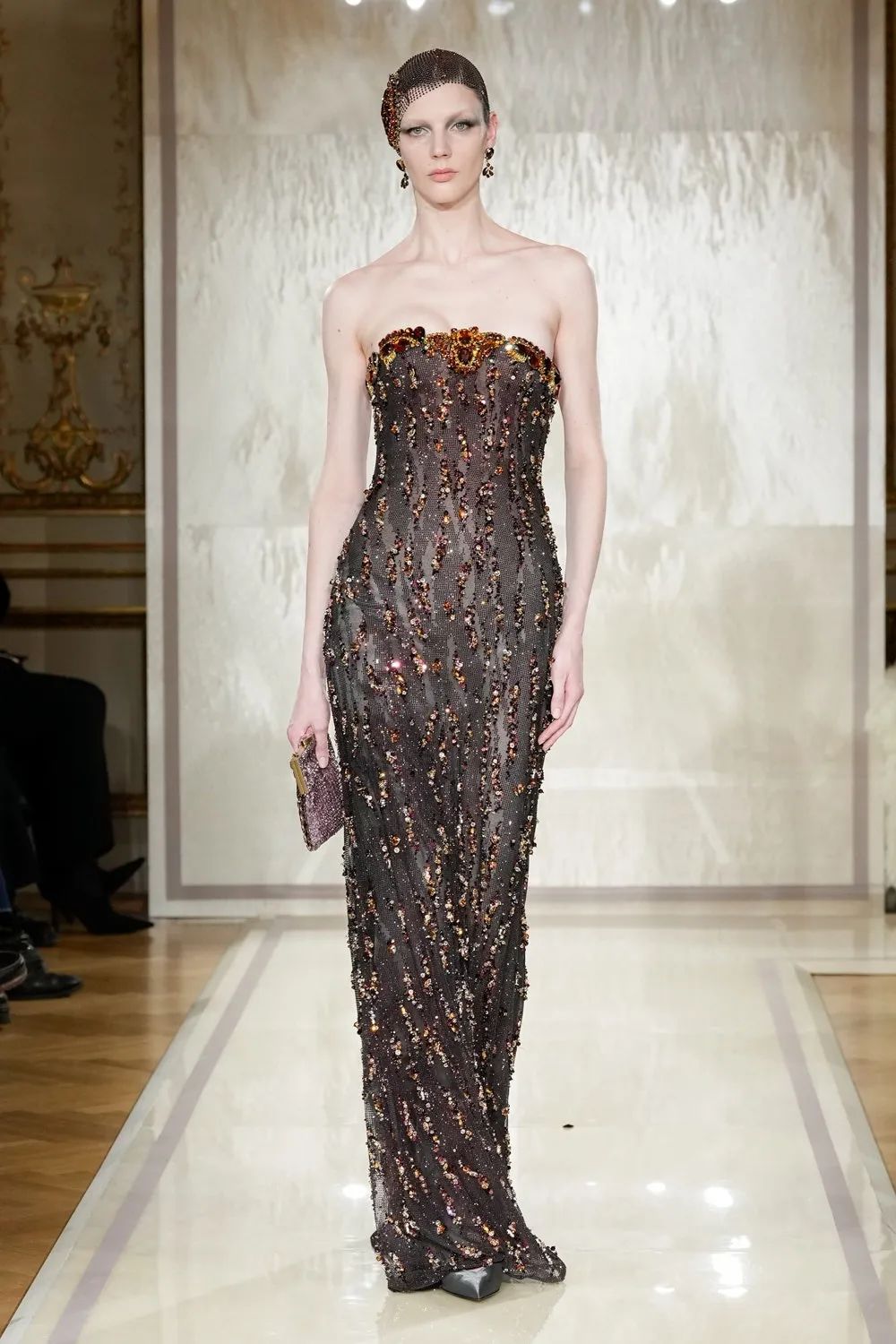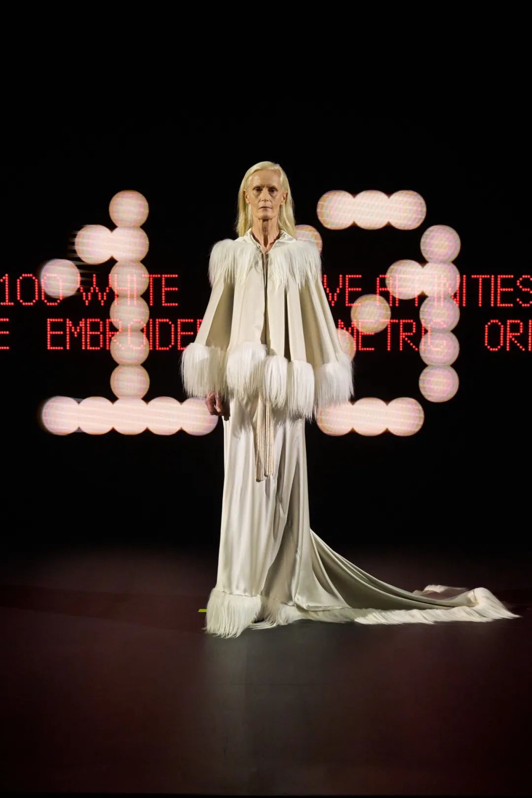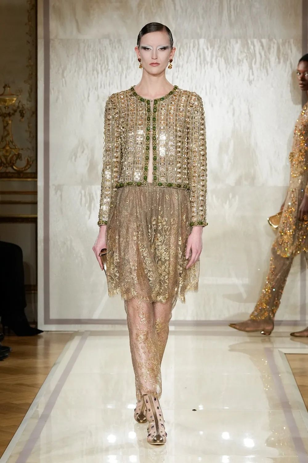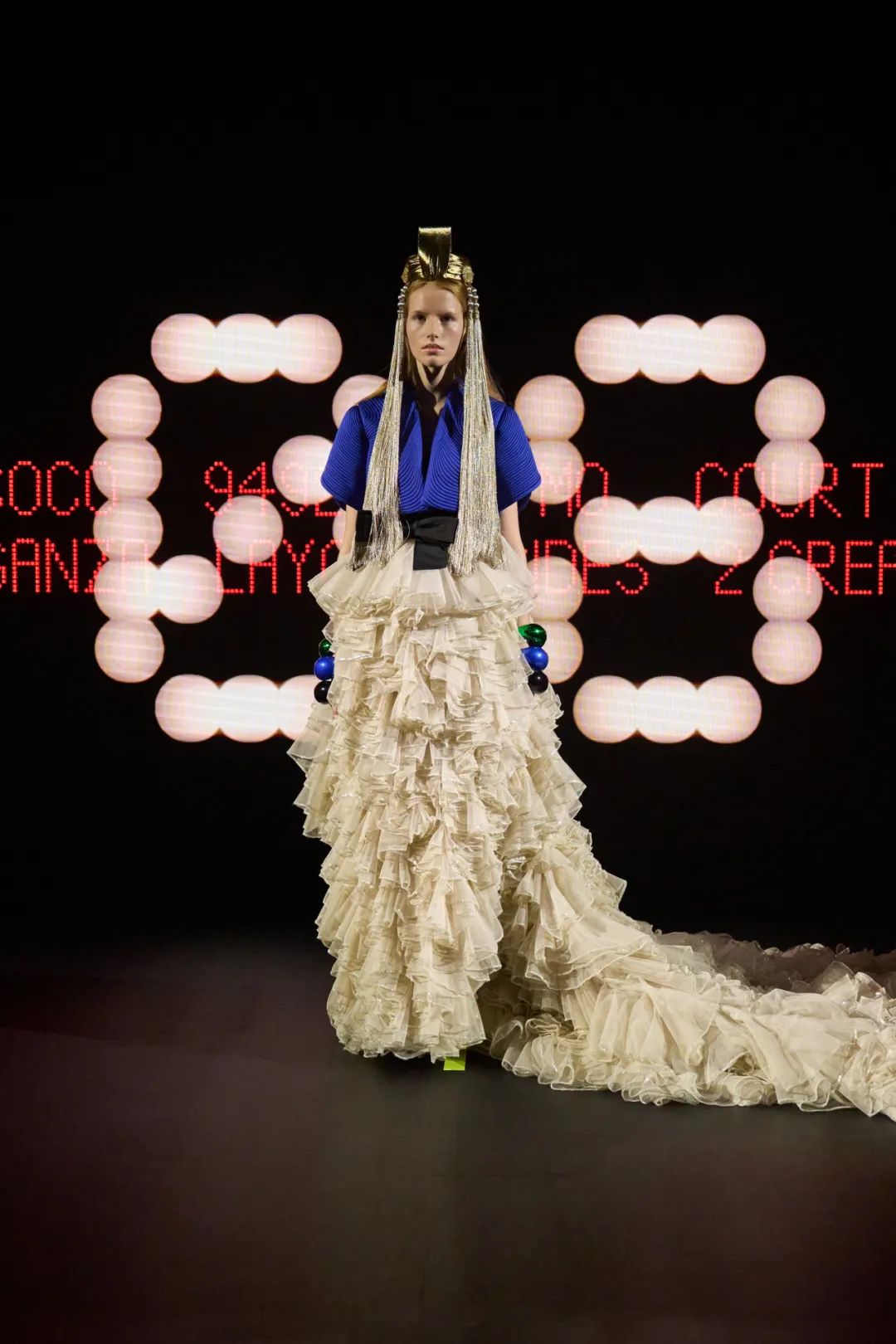 时装秀的轮廓向格蕾夫人(Madame Grès)、查尔斯·弗雷德里克·沃斯(Charles Frederick Worth)、保罗·波烈(Paul Poiret)等标志性女装设计师致敬。裸色和透明的礼服以不对称的重量挂在身上。错视珍珠覆盖在紧身胸衣上,而s型夹克则为精细剪裁提供了证据。从绣有奢华日本号角珠的蛇形曲线,到用法国紧身胸衣塑造的戏剧性、锋利的臀叶,每一个设计都把模特变成了空灵的存在,散发出一种神圣的、超凡脱俗的魅力。
