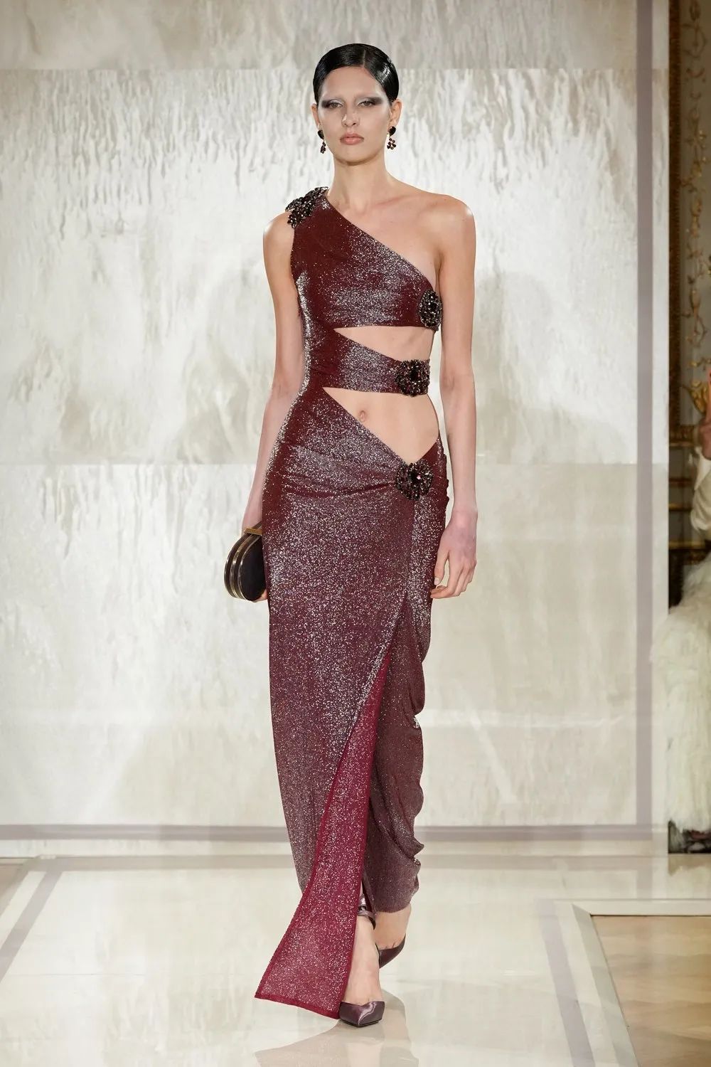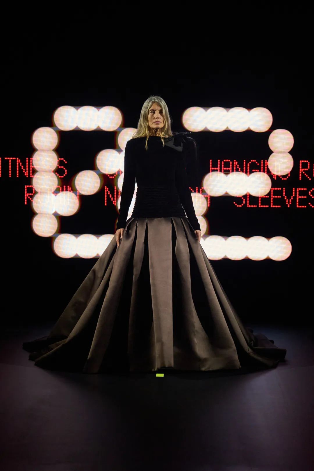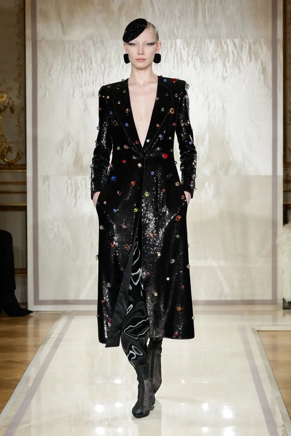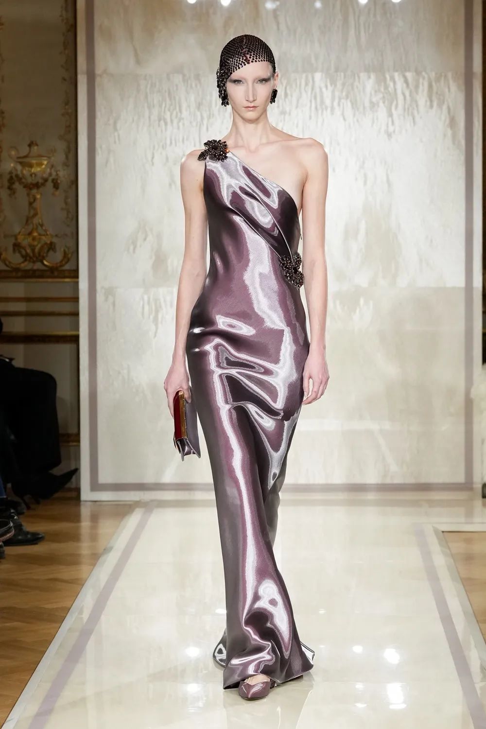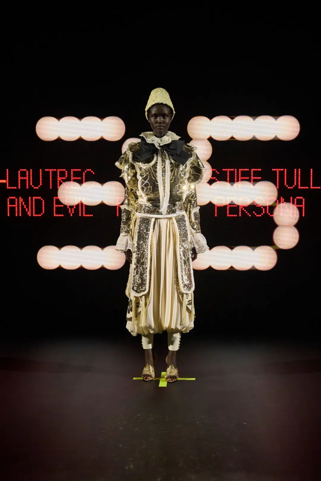 时装秀的轮廓向格蕾夫人(Madame Grès)、查尔斯·弗雷德里克·沃斯(Charles Frederick Worth)、保罗·波烈(Paul Poiret)等标志性女装设计师致敬。裸色和透明的礼服以不对称的重量挂在身上。错视珍珠覆盖在紧身胸衣上,而s型夹克则为精细剪裁提供了证据。从绣有奢华日本号角珠的蛇形曲线,到用法国紧身胸衣塑造的戏剧性、锋利的臀叶,每一个设计都把模特变成了空灵的存在,散发出一种神圣的、超凡脱俗的魅力。
