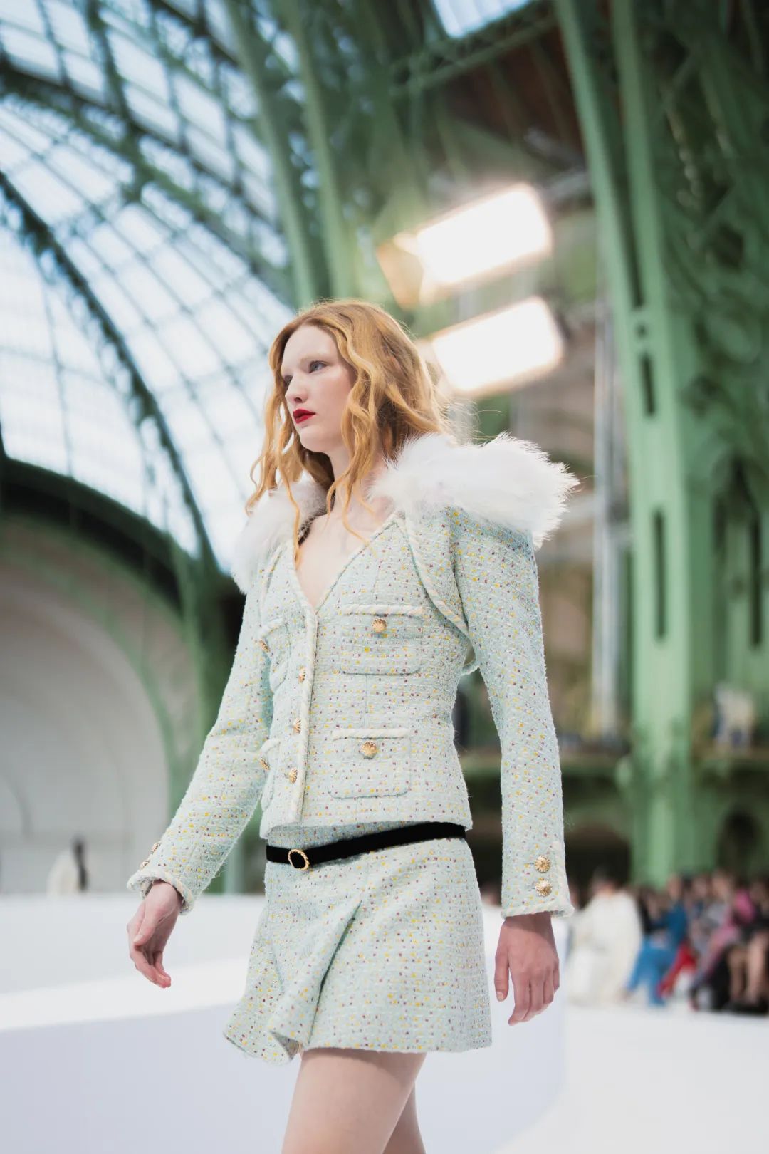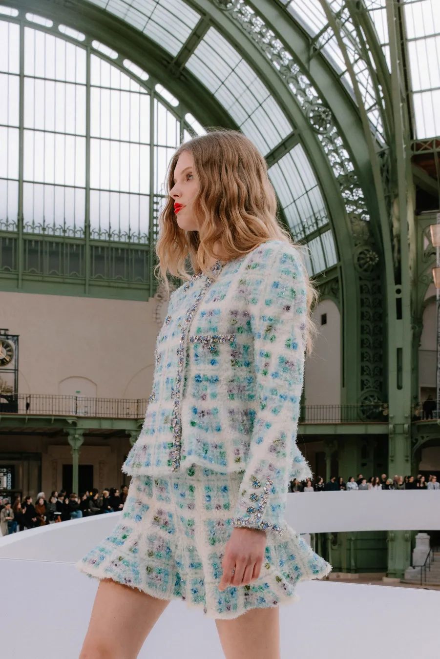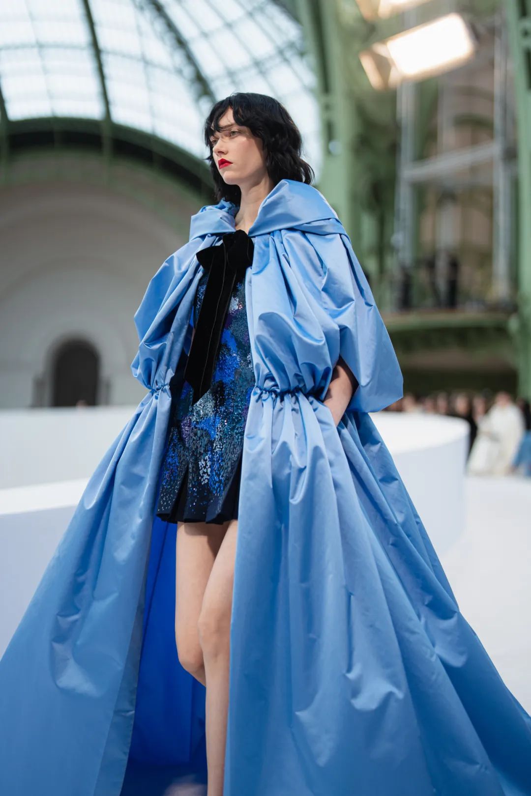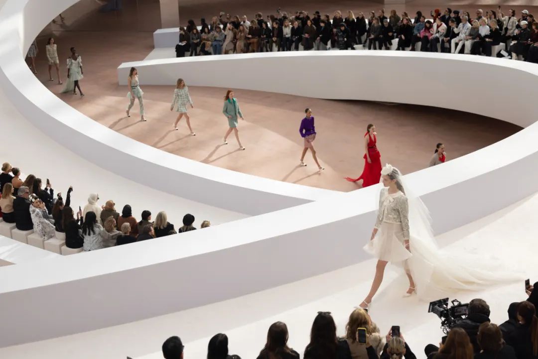 在巴黎大皇宫的中殿,由双C勾勒出T台的轮廓,犹如一个无限符号。它象征着高级定制服的无限卓越,而香奈儿作为现存历史最为悠久的高级定制服品牌,始终坚守着这份传承。秀场由舞美设计师Willo Perron构思,令人联想到精品部创意工作室此次选择创新演绎的色环。作曲家Gustave Rudma与Michel Gaubert合作,为发布会创作了原创曲目。