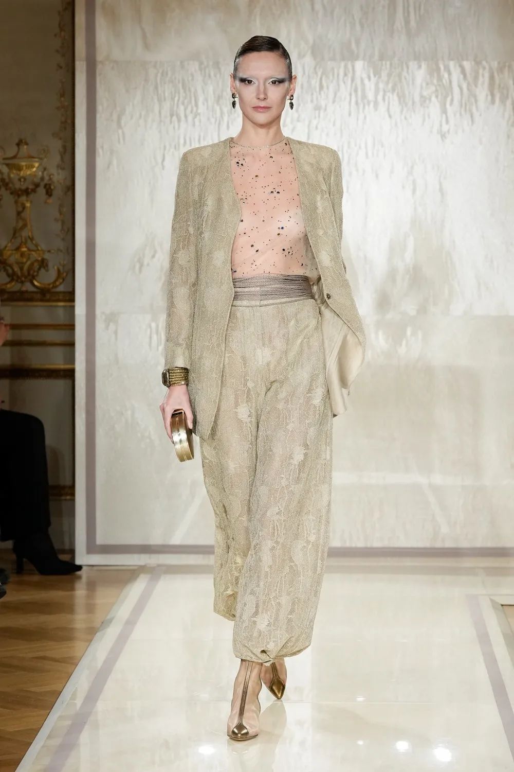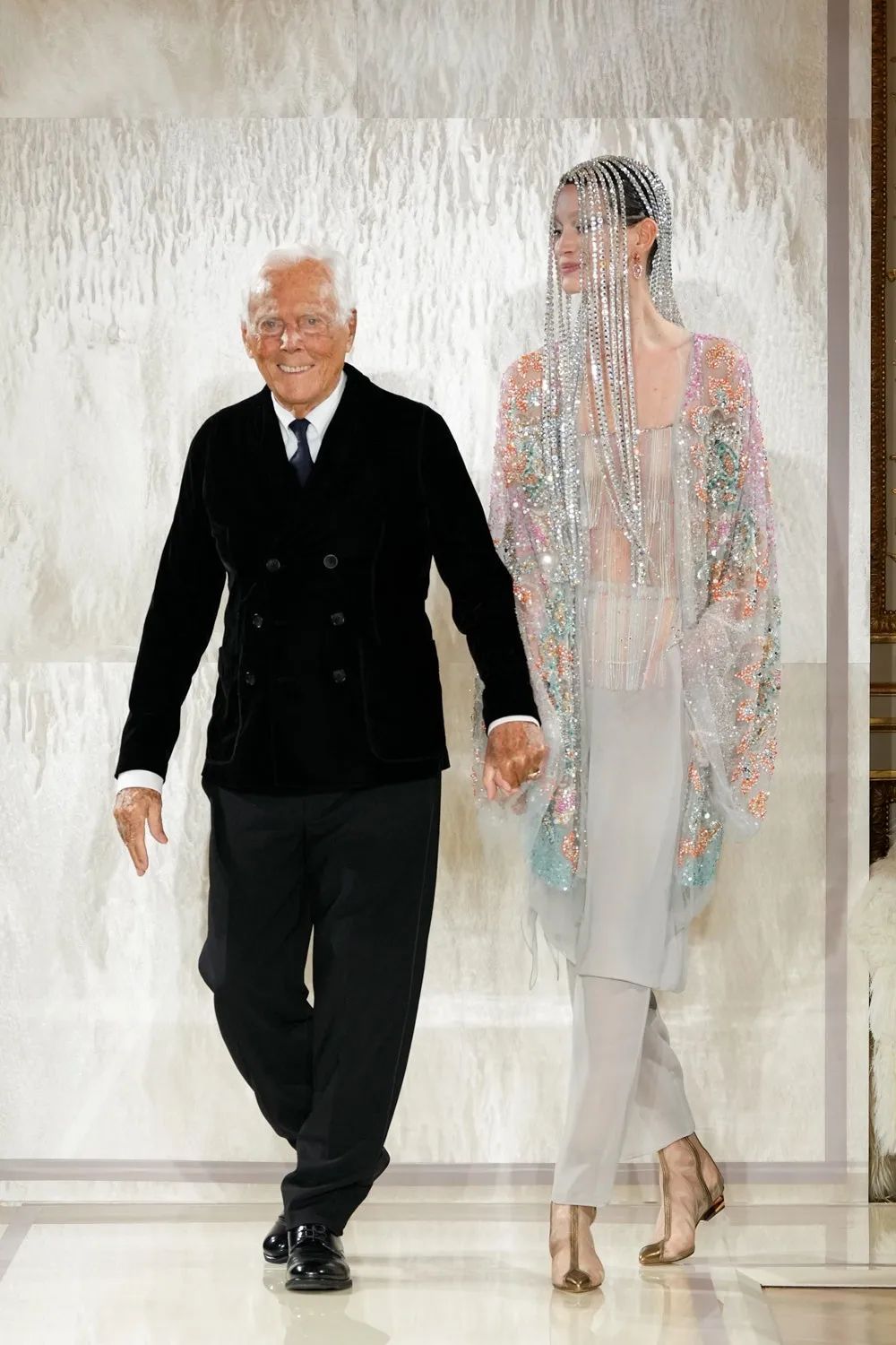 在晚礼服方面,阿玛尼推出了褶皱礼服、单肩设计、低领设计和露背设计,所有这些都散发着他标志性的精致性感。珍珠再次成为一个突出的特点,因为它们象征着宁静与和平。其他款式则以镶有水晶的裙子和合身的夹克为特色。