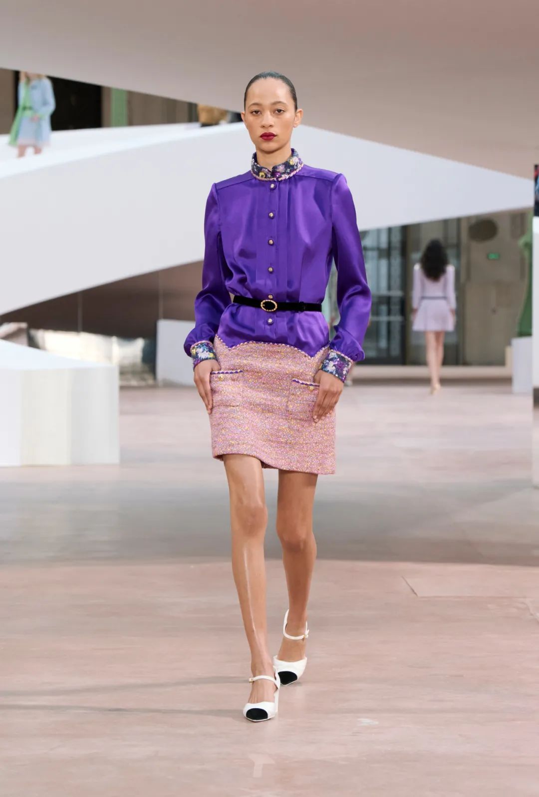 斜纹软呢,口袋,编结滚边,与衬衫相同材质的衬里——有时衬衫与半身裙合为一体,营造出独特的垂坠感;以及精美的钮扣:香奈儿魅力的所有特质都在此得到升华。在充满趣味性的色彩碰撞游戏中,衬里以古铜色、粉色、绿色、黄色、宝蓝色与紫色丝缎打造;编结滚边则视觉鲜明,色彩缤纷,亦或绣以碎花图案。水晶、金属与莱茵石钮扣化作月亮、太阳与山茶花的造型。这些日月星辰元素也出现在黑色天鹅绒腰带上,彰显了黑色之于品牌的重要意义。