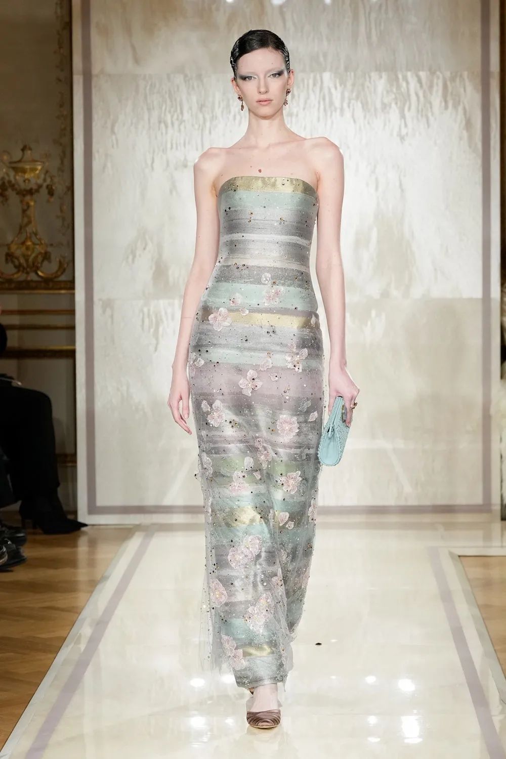 作为 Giorgio Armani Privé 系列二十周年,Armani Privé 2025春夏高定系列时装秀于 Palazzo Armani 拉开序幕。该系列的灵感来自于光的无形之美。在94个造型中,阿玛尼运用了光滑的液体面料、刺绣网和大胆剪裁的亮片礼服…每一个造型都承载着该品牌的标志性传统,是这位意大利艺术大师精湛工艺的证明。