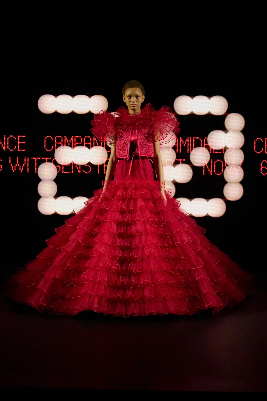 在奢华中,图案既冲突又协调——波尔卡圆点、碎花和层叠的荷叶边,无一例外都是米歇尔的风格。不可能的组合找到了和谐,跨越时代的文化与过去的回声在此交织,并与当下产生共鸣。每一根线、每一缝合、每一抹色彩都转化为超越可见界限的多重语言。