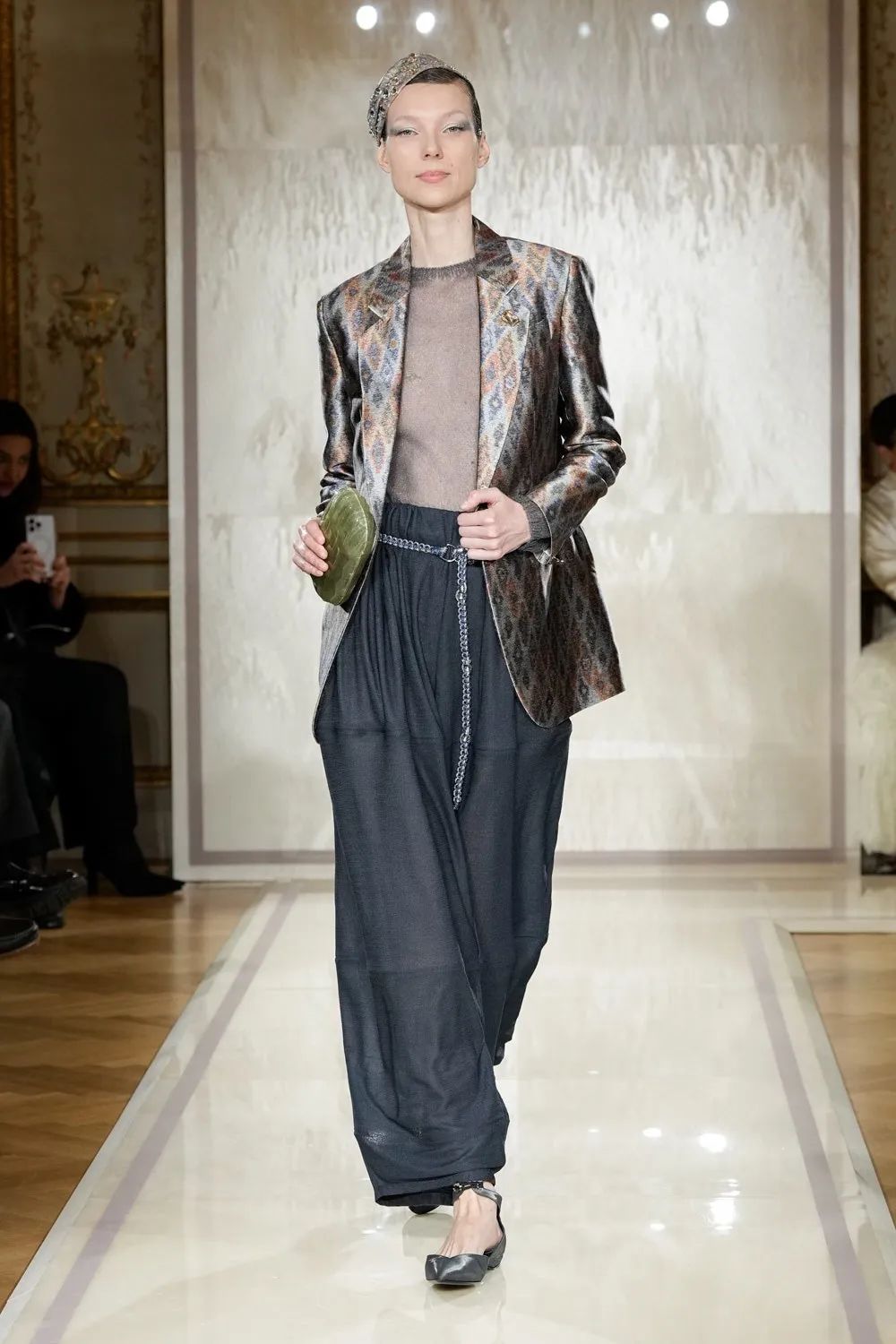 一如既往,阿玛尼的剪裁占据了舞台的中心位置。裤子——他最重要的标志之一——有一系列的轮廓:修身的、褶皱的、柔软的气球状的、束在脚踝处的,或者塞在晚礼服靴里的。他们的风格是宝塔袖夹克,不对称的束腰外衣和马甲,融合了结构优雅与轻松,冷漠的空气。