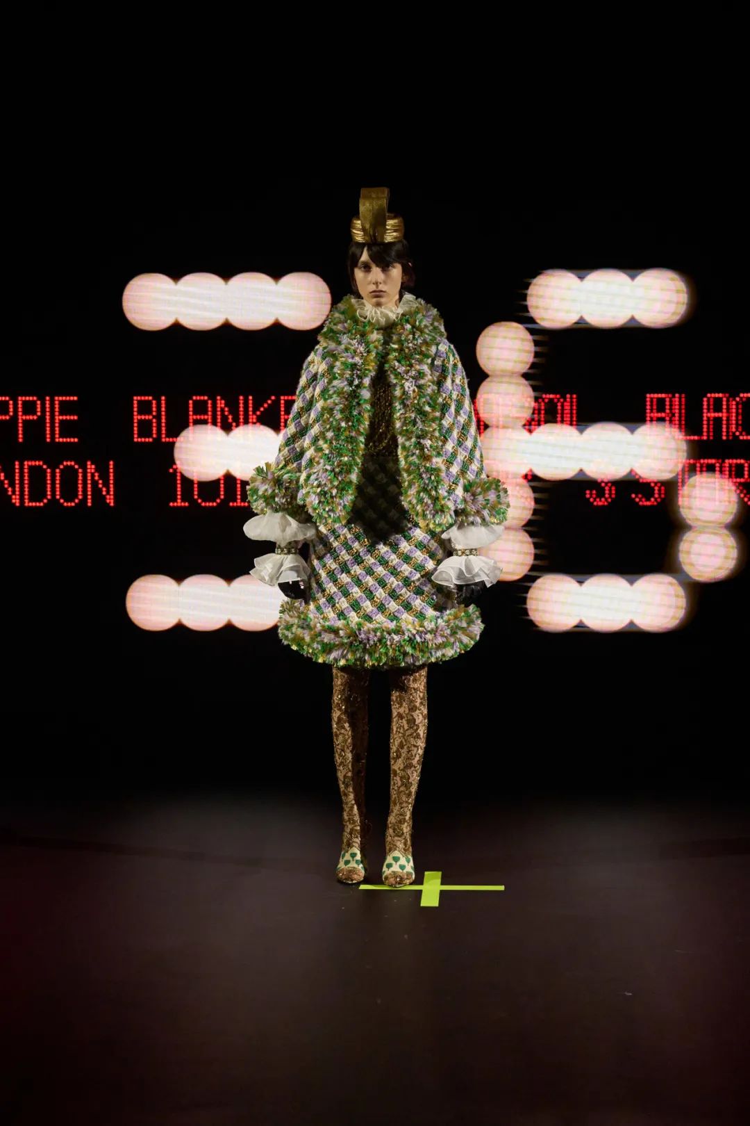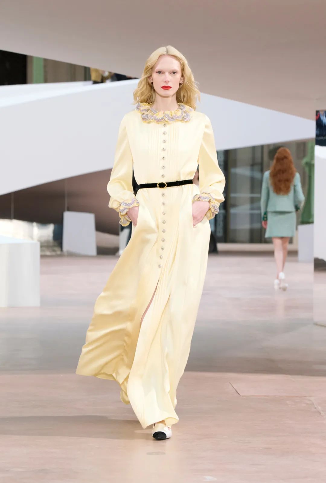 继而亮相的是橘粉色大衣内搭紫色提花连衣裙,以及含羞草色礼服套装,其上点缀淡粉色荷叶边细节。系带鞋的配色亦遵循同样的逻辑,无论平底或带跟款式,色彩从天蓝色、淡紫色到白色与奶油色不等。